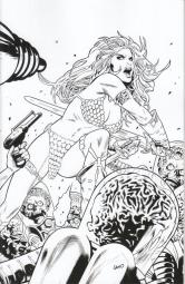 New master of horror comics, Jay Stephens (Dwellings, Tales From The Abyss) and Red Sonja/Mars Attacks artist Fran Strukan stir some adventure and dark comedy into a cauldron of ancient Hyborian terrors! While serving out a life-debt, Red Sonja uncovers a sinister prophesy of cosmic foulness from beyond the stars and must trek from the deserts south of Hyrkania all the way to the northern shores of the Vilayet Sea to face down the insidious invaders from Mars. Serpent-Men! Undead Martians! Gender swapping! Apemen! Metamorlocks! Martian Pirates! Angry ancient Monster-Gods! An owl with a human face!... don't miss this retro-scifi/fantasy epic that is sure to take you places you didn't imagine were possible.